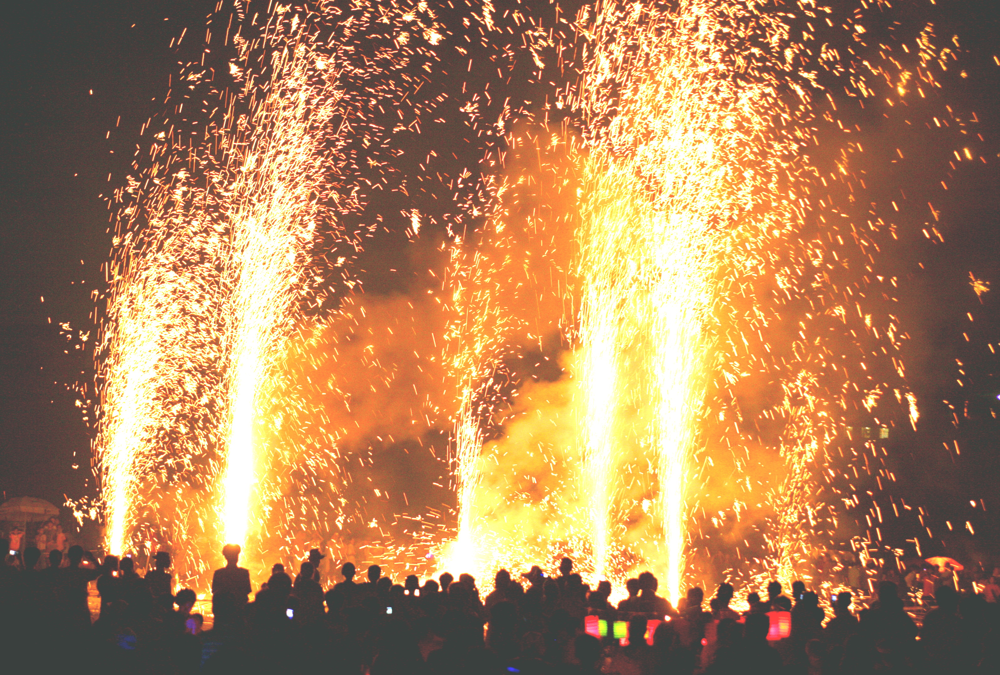 “高升”有些类似汉家的焰火,成排的铁铳装满火药,点燃后,火花升起,前赴后继,声震长空。虽然没有现代焰火放得高,但排列在一起,一堵火墙,好大的声势。