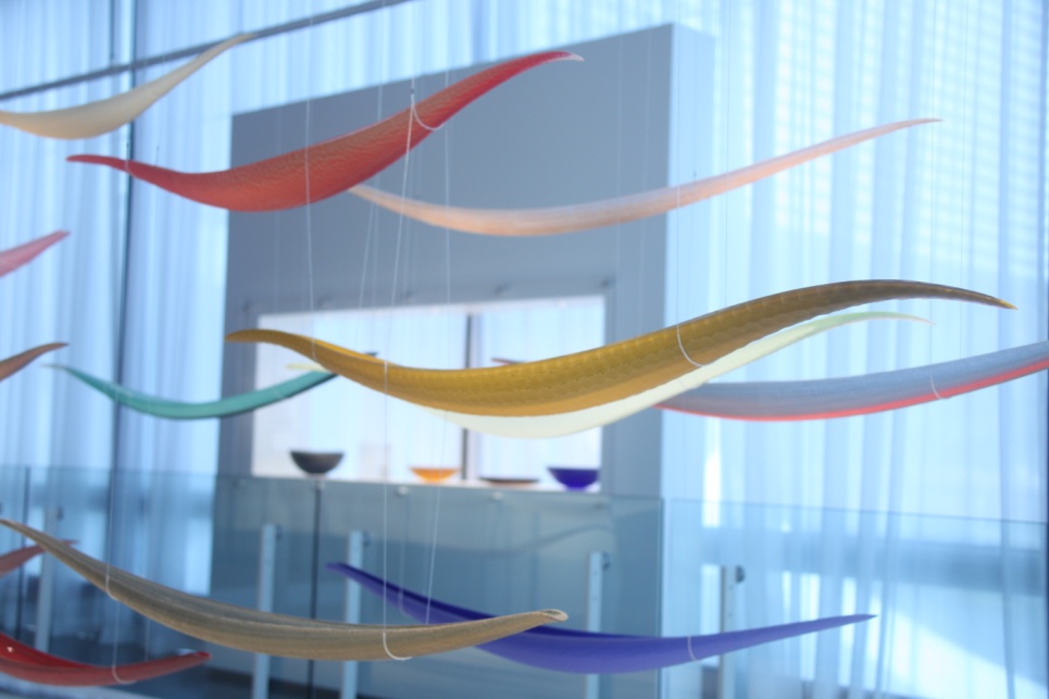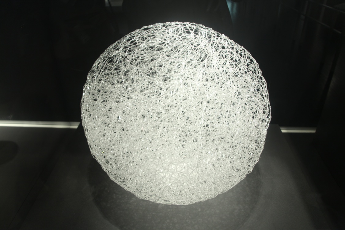 这里有大师的作品:一个半米直径的玻璃丝缠绕的圆球,镂空细密,晶莹温柔,题词:“交织的天空,缠绕得大地”。据说反映的是玛雅的织布文化,我得感谢高翔的翻译。