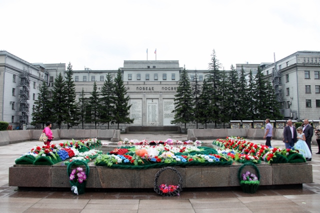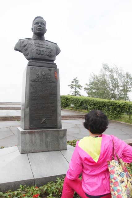 通向文化广场有一座天桥,桥栅栏上挂满各种拴着红布条的铜锁。这是新人结婚的杰作。桥直通烈士纪念碑,那里有无名烈士塑像,有花坛、长明火,两侧花岗岩的石壁,刻着为国捐躯烈士的名讳。我们到来,正有新人在这里举行结婚仪式,婚纱、鲜花、穿着民族服装的儿童。王小平走上前邀请合影,受到俄罗斯家庭的欢迎。苏联复归俄罗斯,没有泯灭苏联的这一传统。