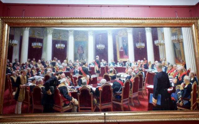 《御前会议》,一幅巨型油画,占了20米长,7、8米高的一面墙。反映日俄战争前,俄罗斯沙皇召开御前会议的景象。大型会议,近200人的肖像,主战、主和、各怀鬼胎,神态各异。据说列宾和他的学生画了两年。