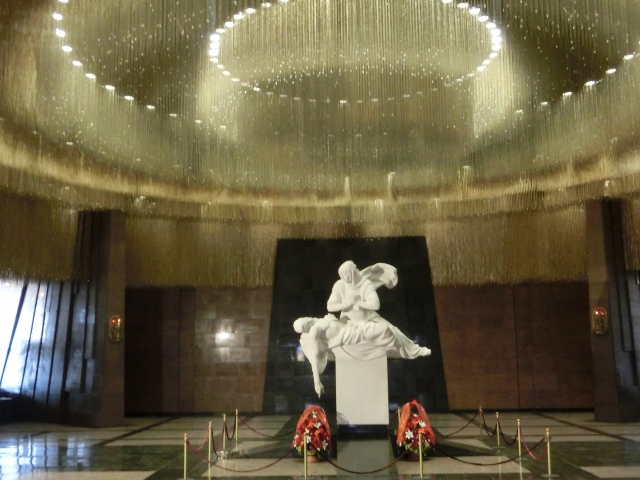 我想起刚进大厅,一座滚梯,对着一片穹顶,闪闪夺目。细看,一串串水滴样的玻璃珠,密密的垂挂,晶莹闪烁。讲解员告知,这是300万滴泪水。我明白这才是展览的主题,这才是纪念战争的意义。我听见那首用上千万人命凝结的“列宁格勒交响曲”在人类的心中演奏。