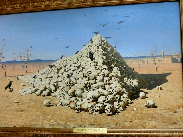 前期,13世纪到17世纪多是宗教画。17世纪后肖像画、宫廷画增多,战争的题材逐渐取得主导地位。这里有“土耳其斯坦”组画,反映第一次俄土战争。其中一幅:大地苍茫,远远的地平线,残垣土屋,正中一座尖愣的骷髅堆,寒鸦枯树。没有战争场面,头颅的堆砌,尽显杀戮残酷。没有呐喊,静,几声鸦噪,传出的却是铮铮金鼓。
