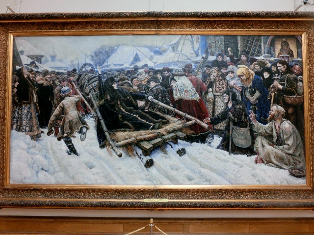 你看:宗教改革,索非亚对抗,被送去修道院。教堂、雪地、雪橇,索非亚穿着传统的黑色长袍,裹着黑色的头巾,斜躺在上面。周围是百姓:坐地乞讨的乞丐,跪地祷告的老妇,手画十字的富翁,面目惊悸的母亲,随车奔跑的儿童,手持武器的士兵······,人物不下百人,有的悲悯,有的痛心,有的惊诧,有的哀婉。也有窃窃自喜,也有童真无忌。那表情、那心态无不跃然纸上。而索非亚手戴镣铐,怒目苍天,右手高举,倔强的伸出双指,表示着对旧仪式的虔诚。