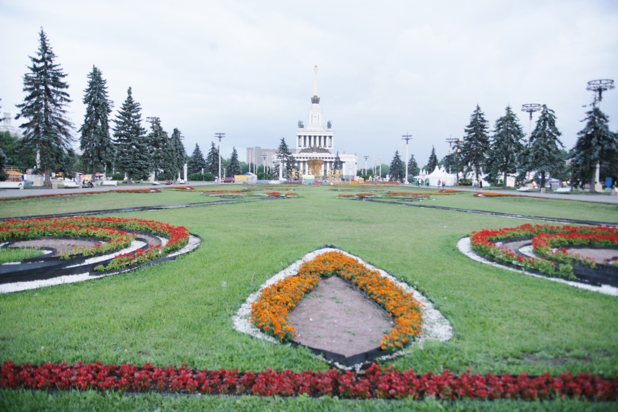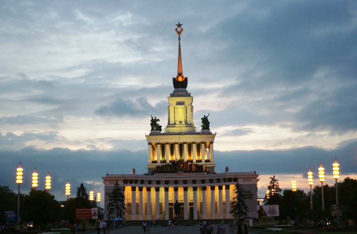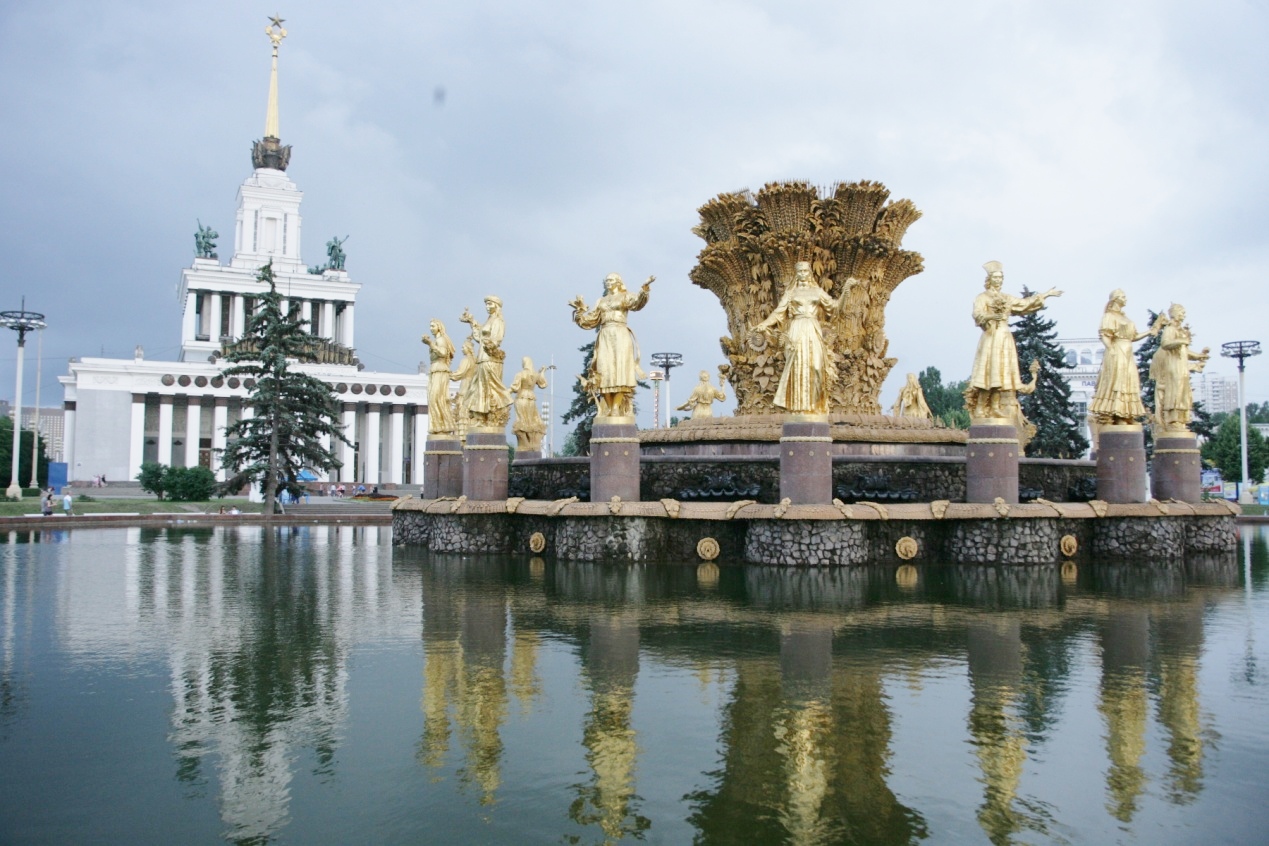 按小谭安排,今晚12点乘火车去彼得堡。之前,到国民经济展览馆参观逗留。这是一个大型的广场,由代表着前苏联的各加盟共和国和各州共70多个大大小小的场馆组成。大广场,长甬道,高高的台阶,雄伟的扇形牌楼,雕刻着金色的图案,一个庞大的帝国图腾。如今帝国已去,很多青年围着喷泉滑旱冰。