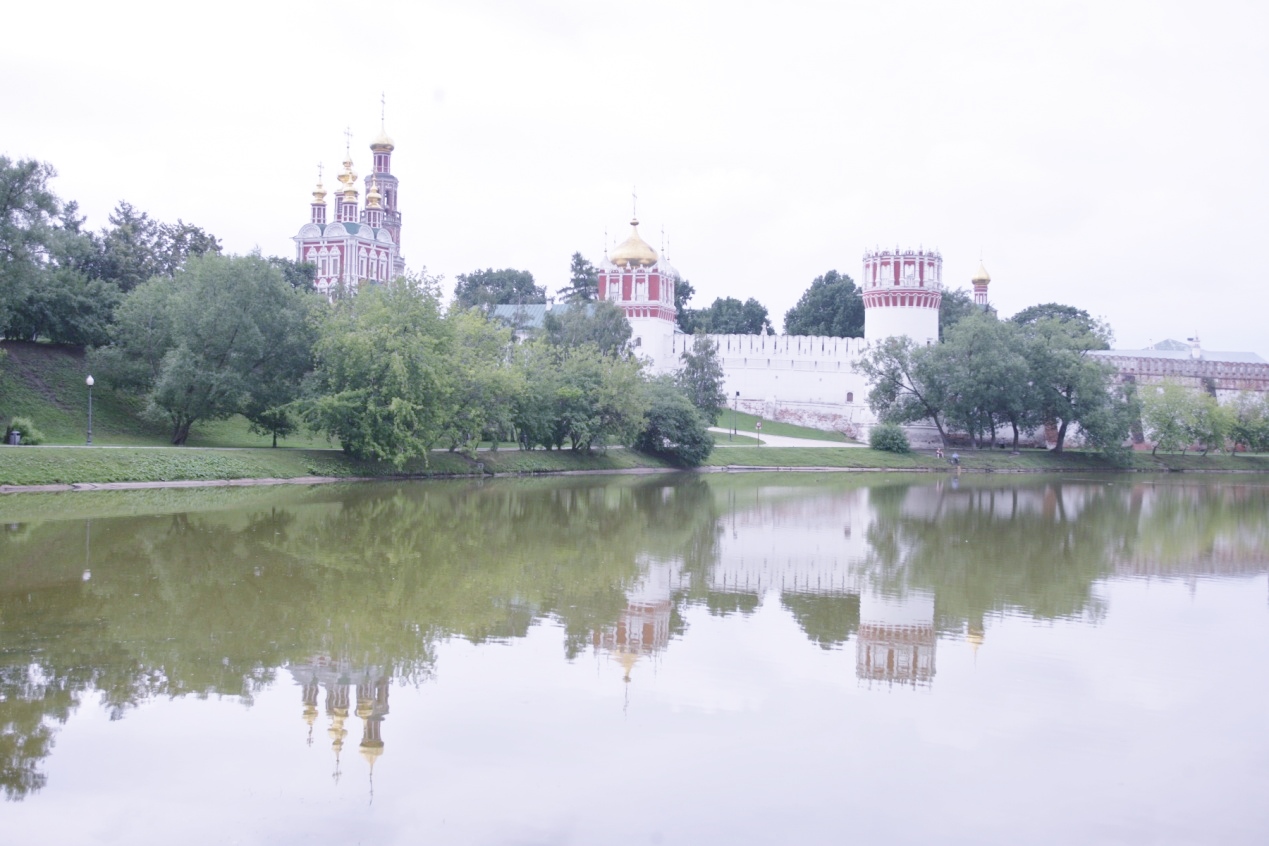 湖边,寻到一个角度,棕红色的城墙,雄伟的门楼,绿荫中斯摩棱斯教堂五座金色的圆顶,衬托水中的倒影,莫斯科的美古典的如此深情。