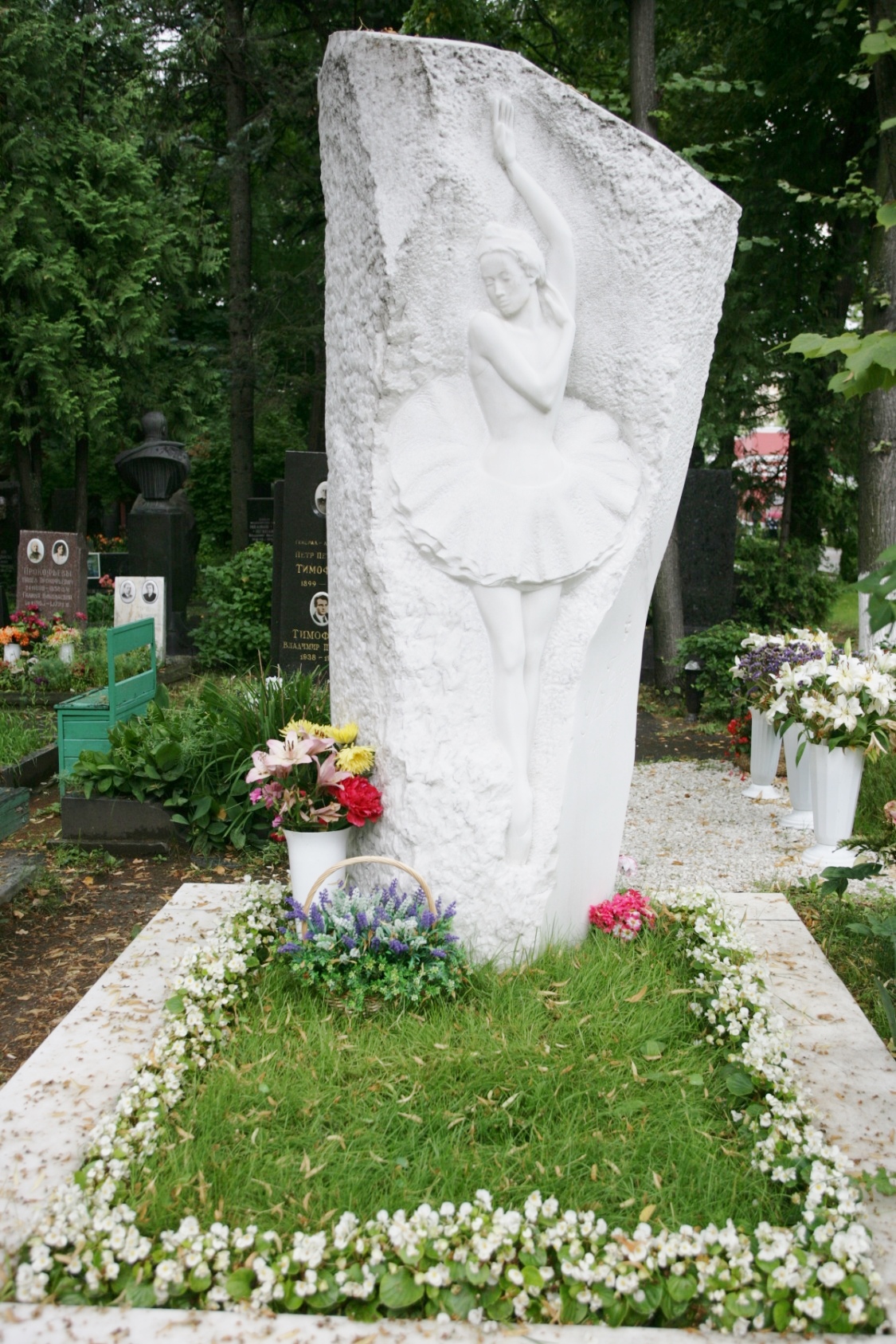 突然一座造型独特摆满鲜花的陵墓吸引了我,张建告诉我墓碑上写着:功勋舞蹈艺术家——乌兰诺娃。我的眼前浮现起那只清丽绝艳的“白天鹅”。那是我看过的最美的芭蕾舞,高贵典雅的气质,近乎绝唱的舞姿,那份脱俗,那份哀怨,让人怜惜的心都发抖。