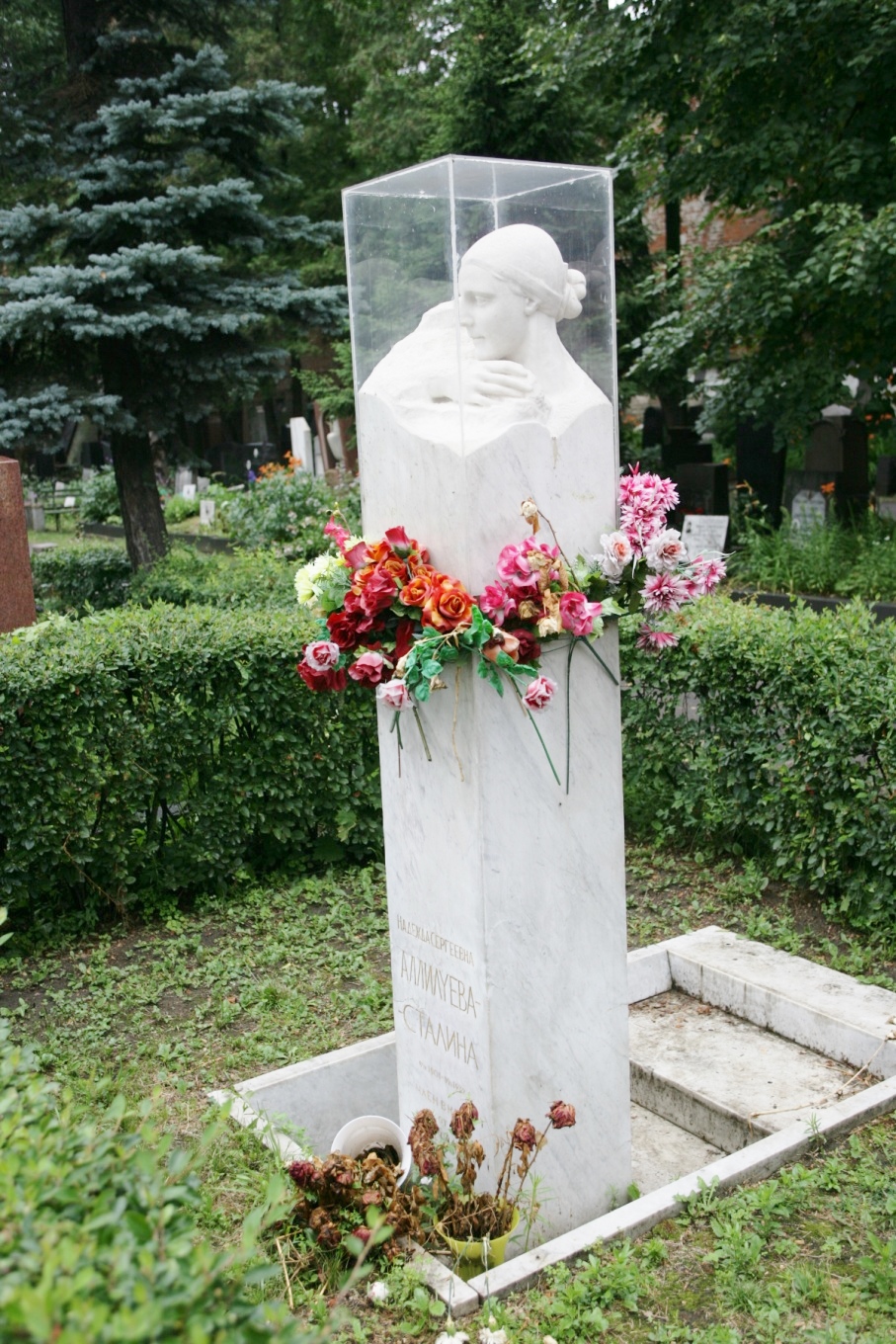 我找到斯大林的妻子阿利卢耶娃,一座神态忧郁的白色大理石半身像,也许是吊唁的人多,经不住众人的抚摸,被罩在玻璃框内,碑前摆满鲜花。