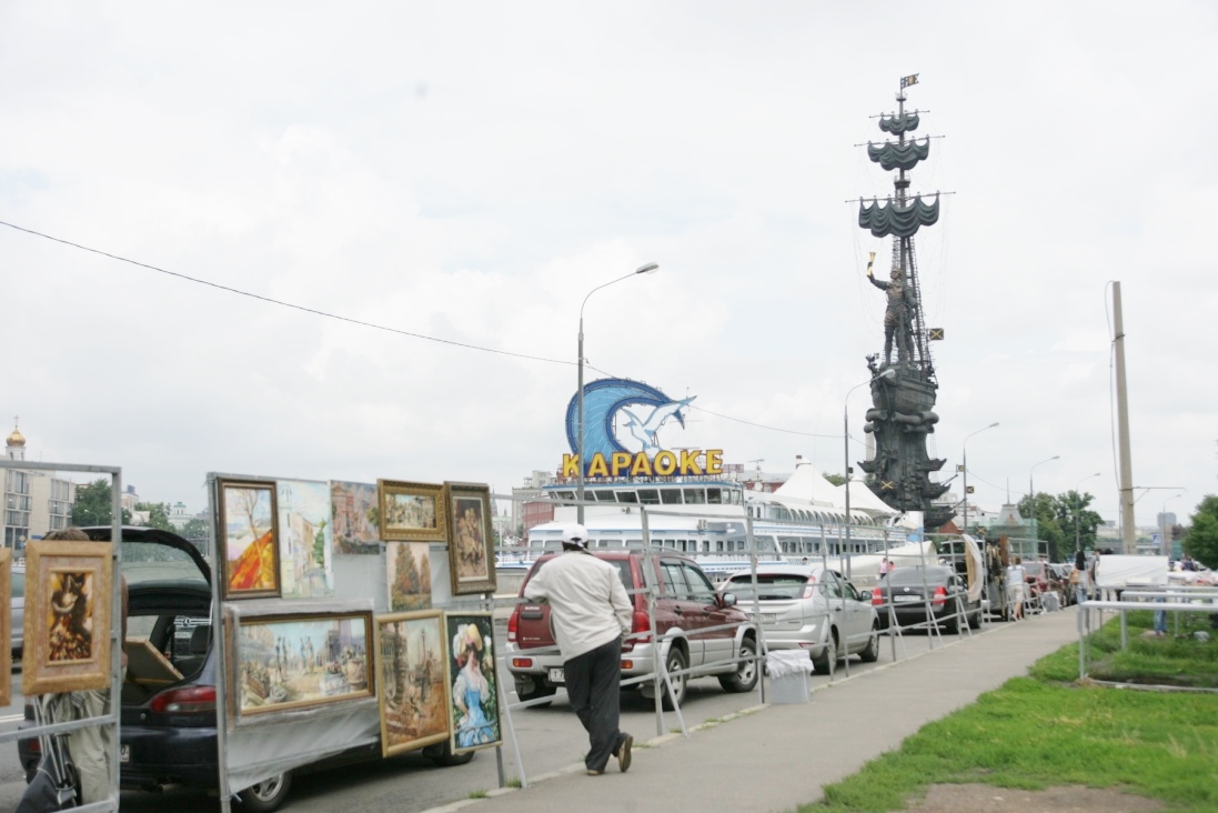 1点来到莫斯科的图画市场。一条独特的商街,占了马路一侧的人行道。商街由上百个屋子大小的木框架组成,延绵一公里多。每个框架是一个独立的展室,展示着一个画家的创作。画家并不都在现场,由画贩管理。