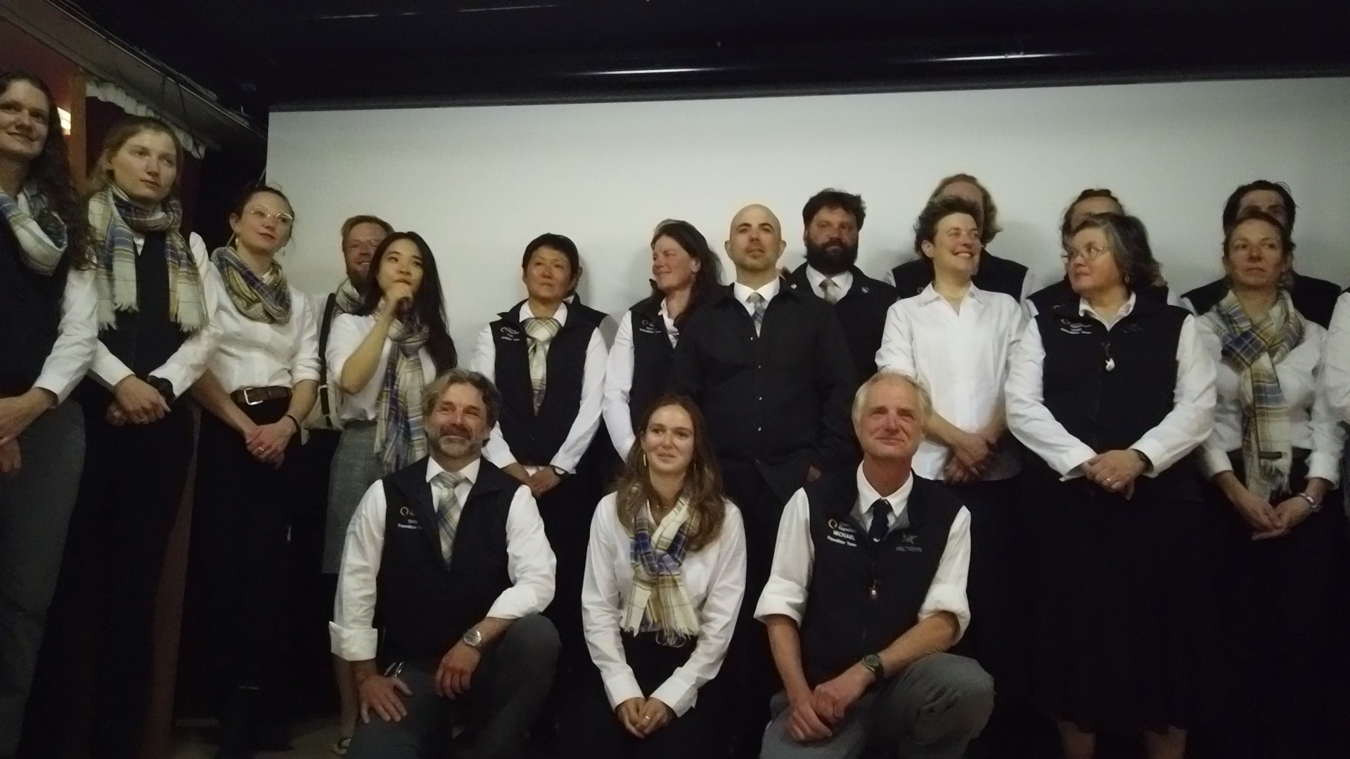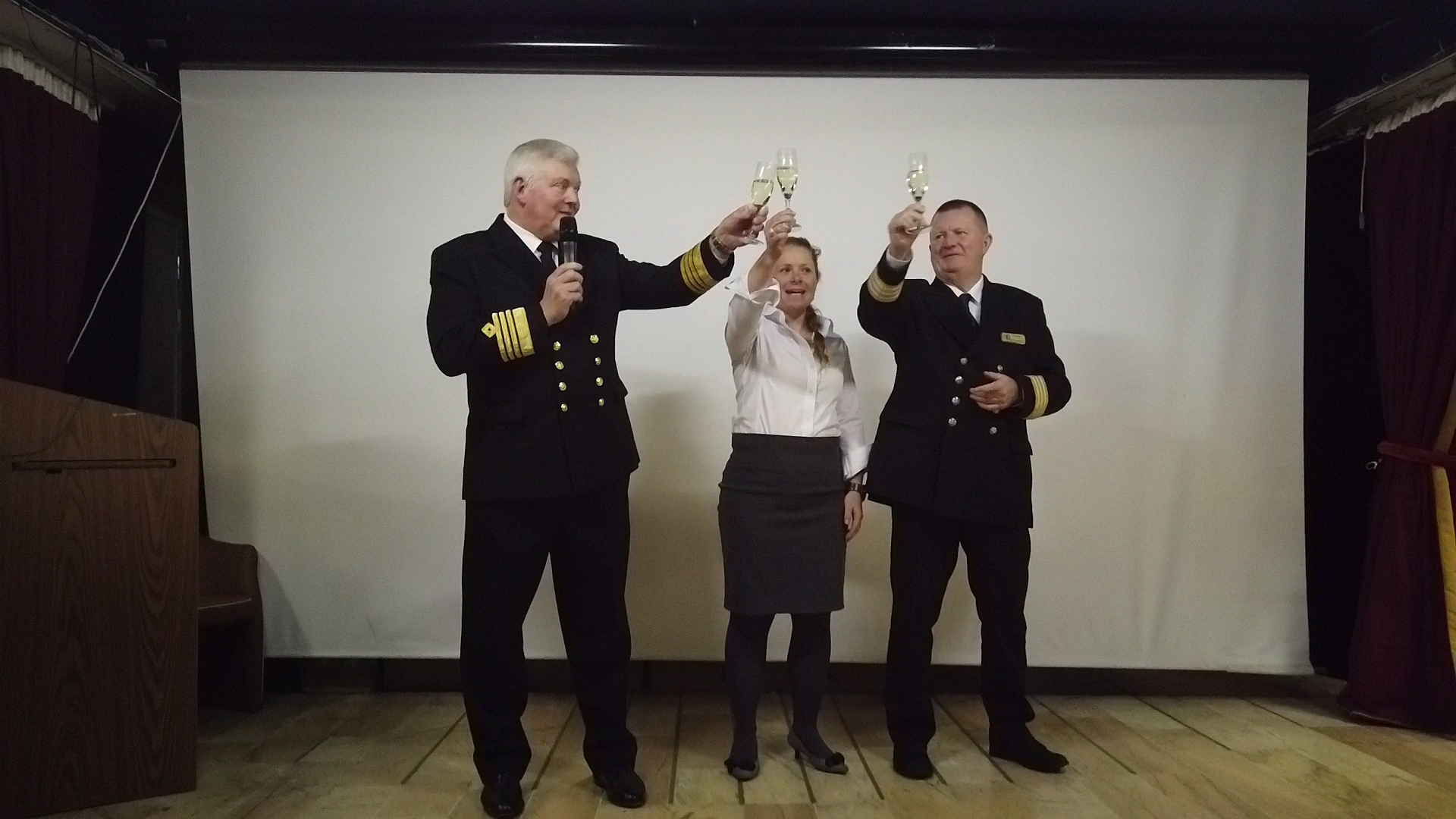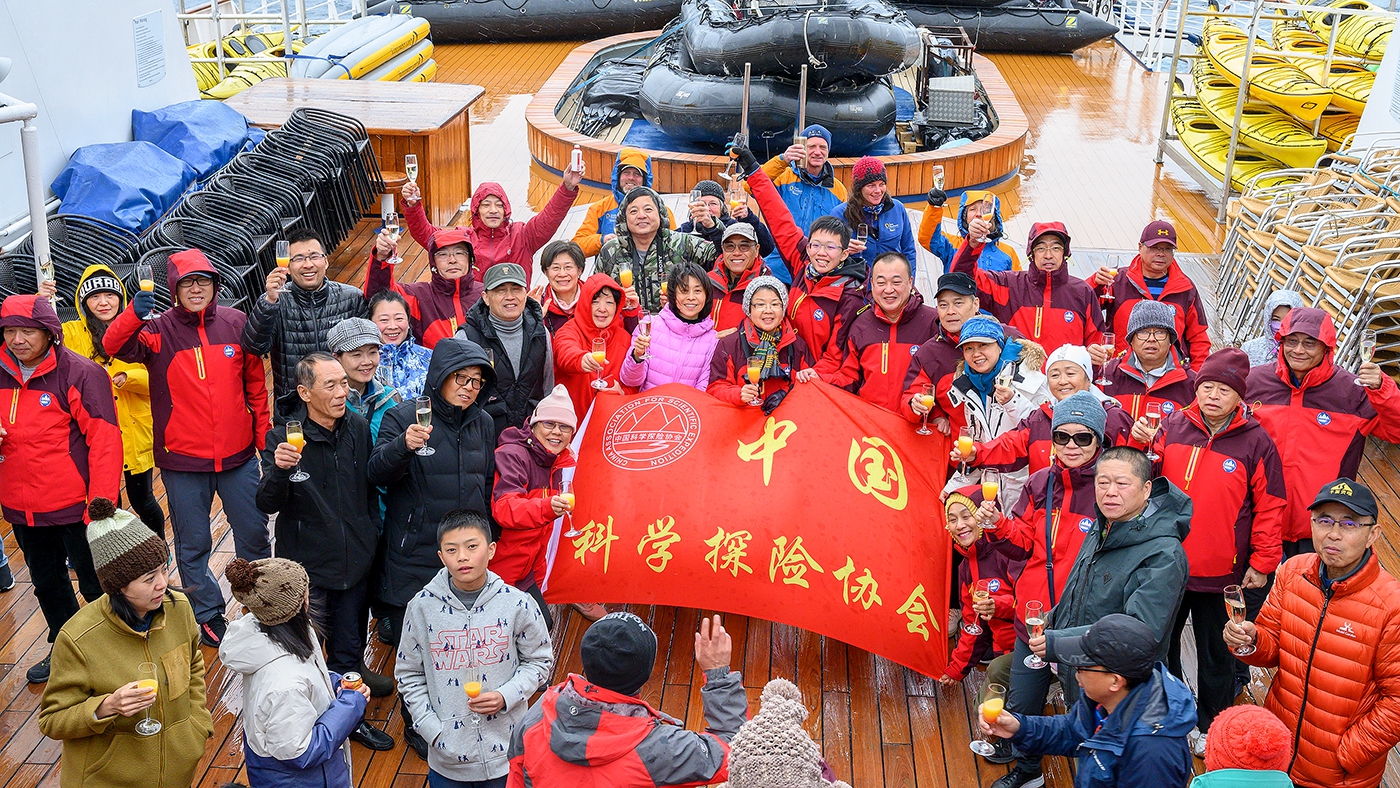 这是船长、探险队长、饭店集团经理举杯祝贺探险旅游顺利结束!