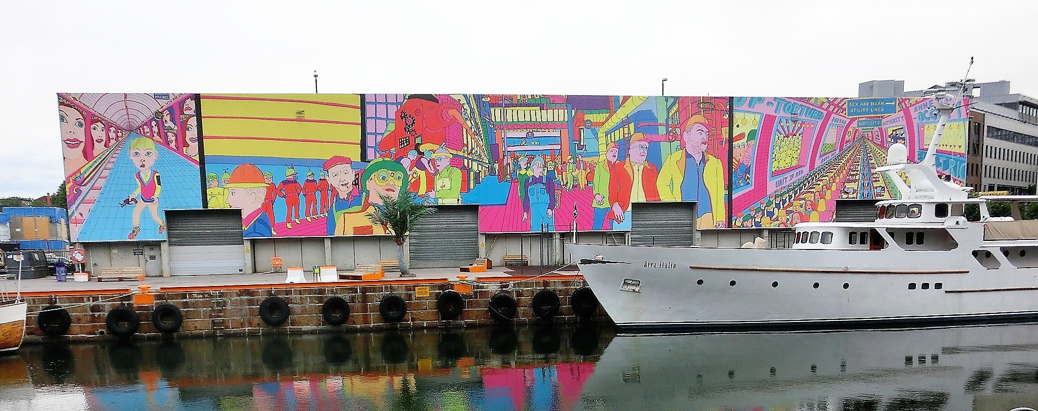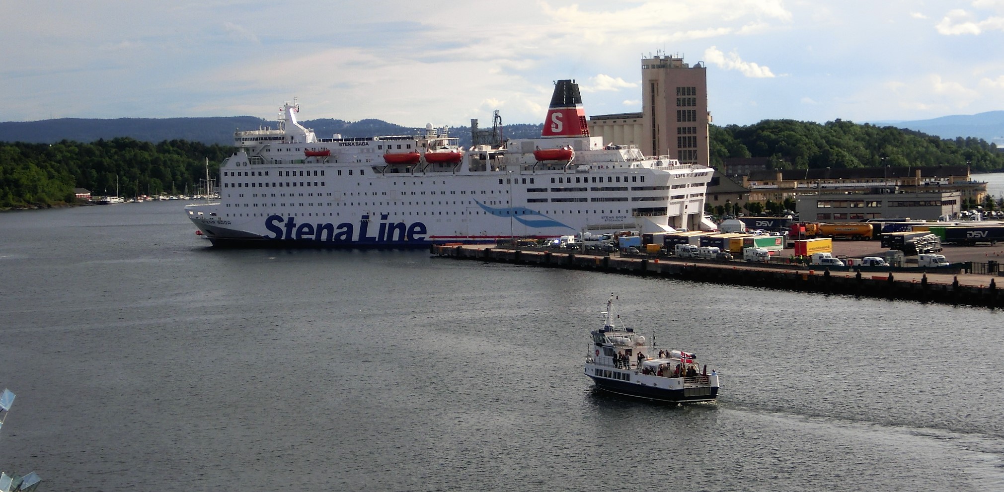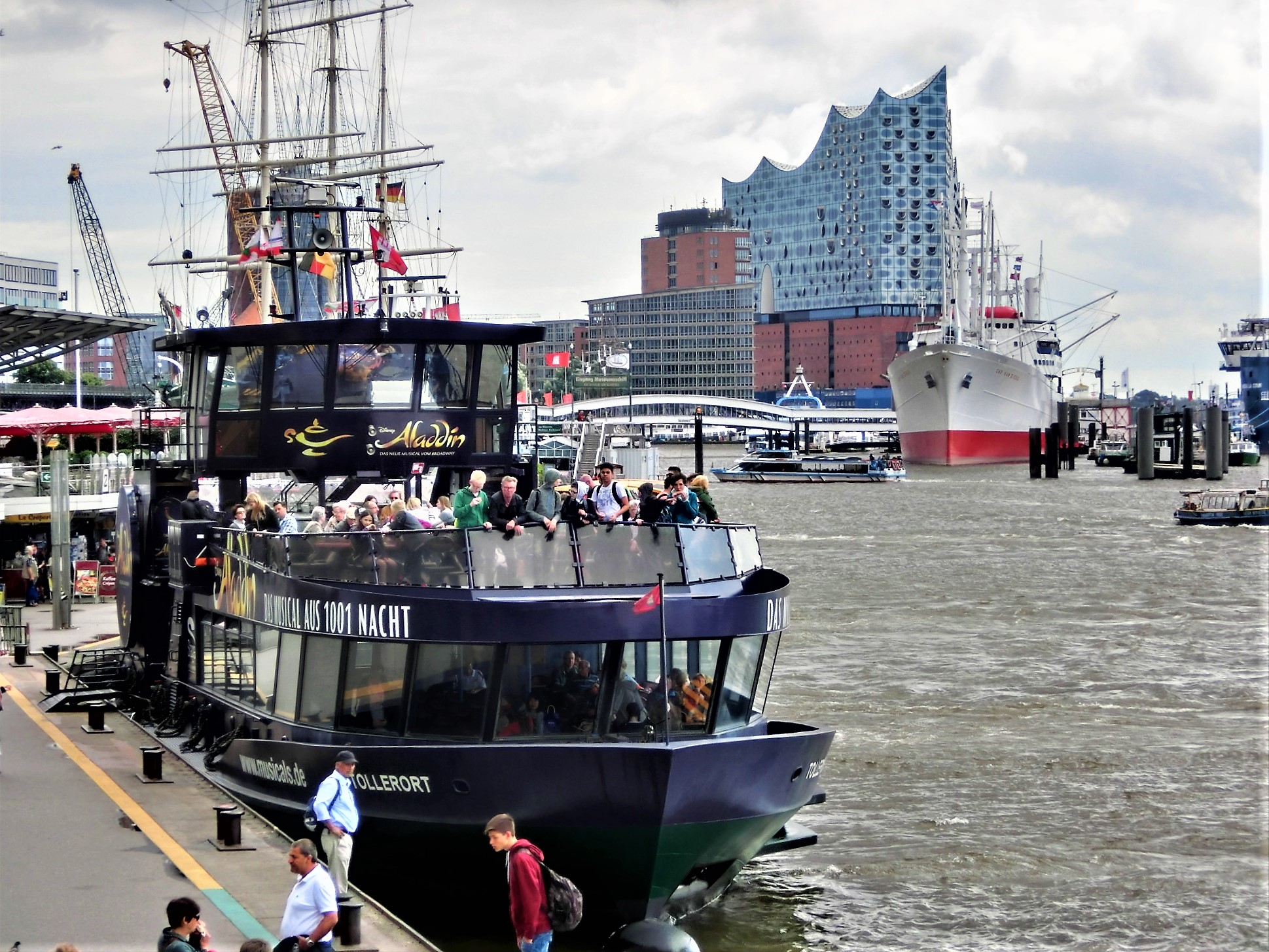 看看这张照片:一只游览船,远方有大货轮,巨大的码头办公楼,现代的很。