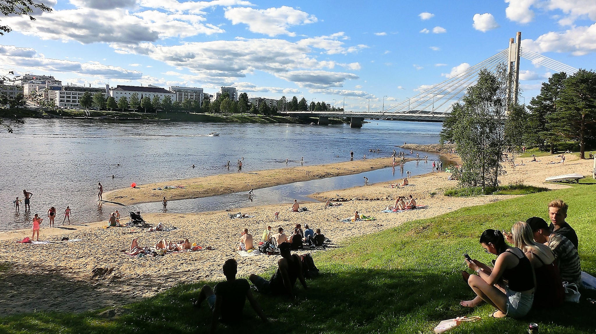 其实最吸引人的是河畔公园。这里每年6月到8月,夜晚亮如白昼,人们带着营帐到这里野游。可驾驶水上摩托、游泳、骑马、徒步,人们在这里聚会、娱乐、晒太阳,比起刚走过的商业街、博物馆要热闹的多。
