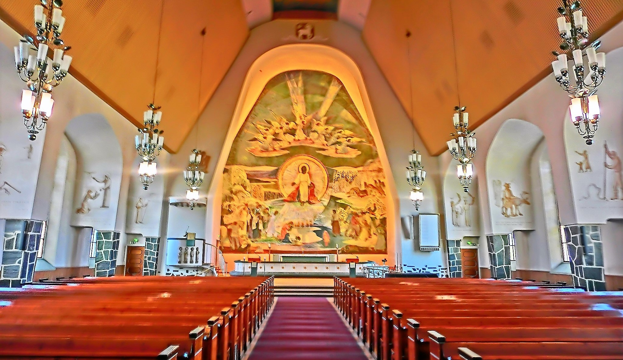 这里,二战被摧毁,战后美国人帮助重建。看看这幅壁画,14米高,1951年创作,被称为“生命的起源”,镇龛之宝。认真看:正中祭坛,带有光环的上帝;周边:人类进步历程的画图。说明着什么?上帝引领人类走向光明!